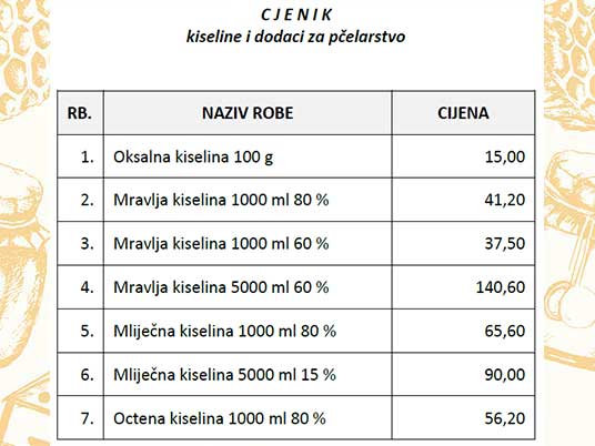 Partner naše pčelarske udruge u provedbi edukacija - Veterinarska stanica Požega - dostavlja nam cjenik proizvoda za suzbijanje varoe i cjenik kiselina. Lijekovi su naravno odobreni za primjenu u 2022.godini. Podsjećamo pčelare da na vrijeme naruče lijek!