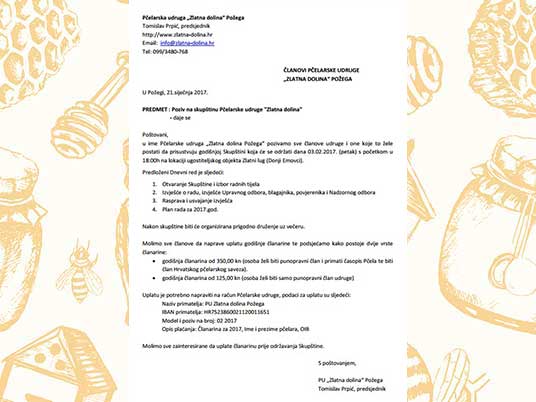 Poštovani članovi udruge Zlatna dolina i svi zainteresirani pčelari u prologu je poziv za skupštinu koja će se održati 3.2.2017. u Zlatnom lugu.